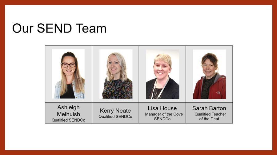 Our Special Needs and Disabilities Coordinators are Mrs Ashleigh Melhuish, Mrs Lisa House, Mrs Amy Jones and Mrs Kerry Neate. The SEND team are contactable via the school office.
