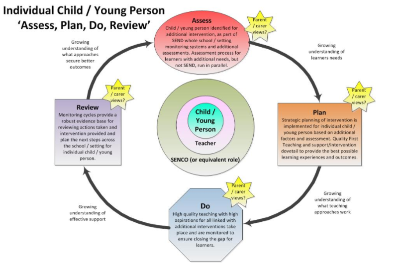 We plan SEND support for our children using the ‘Assess, Plan, Do, Review’ cycle. This is also known as the graduated approach. The views of the child and their family are prioritised and given careful consideration throughout the cycle. The ‘assess, plan, do, review’ cycle can be repeated as many times as needed to help the child progress. Some children will show good progress after the first round of support is put in place, but those with more complex needs might benefit from the cycle being repeated several times.