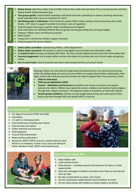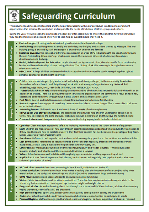Our PHSE curriculum covers all areas of Safeguarding through each of the strands. The curriculum recognises that some subjects are more sensitive than others and ensures that these are taught at an age-appropriate level. When a more urgent need arises, these ay also be taught within a small group or 1:1 level. Our wider whole school opportunities include our assembly programme, various enrichment weeks/days and the application of whole school culture and expectations e.g. behaviour policy enacted in each classroom.